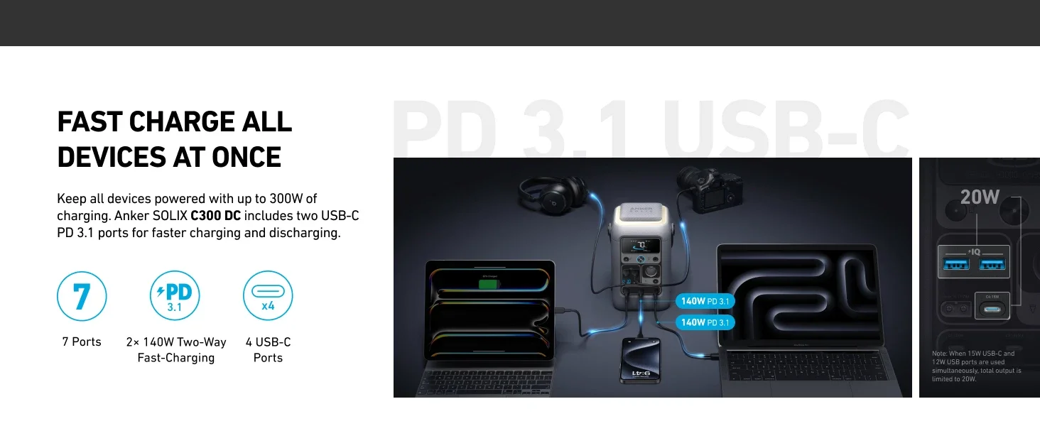 1. Recharge with an 18W or higher USB-C wall charger, such as an Anker USB-C charger or laptop charger. Note that only the USB-C2 and USB-C3 ports can be used.